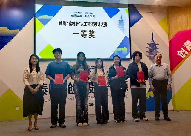 袁蓉为“富林杯”人工智能创新设计大赛的参赛选手颁奖。