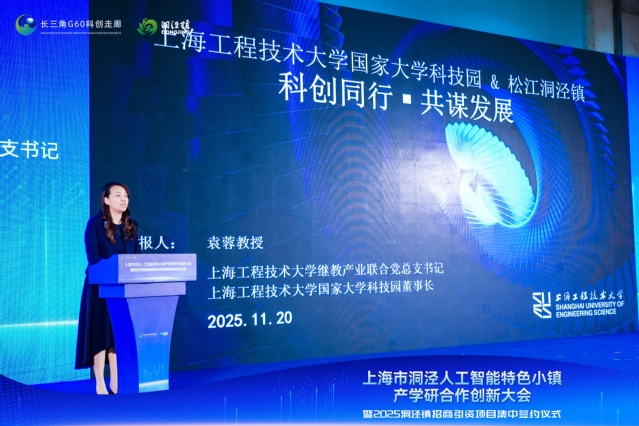2025年11月20日,上海市洞泾人工智能特色小镇产学研合作创新大会暨2025洞泾镇招商引资项目集中签约仪式隆重举行。上海工程技术大学国家大学科技园(以下简称“上工程科技园”)董事长袁蓉应邀出席本次大会,与来自政府部门、高校科研院所、人工智能领域企业的嘉宾代表齐聚一堂,共商产学研合作新路径,共绘人工智能产业发展新蓝图。