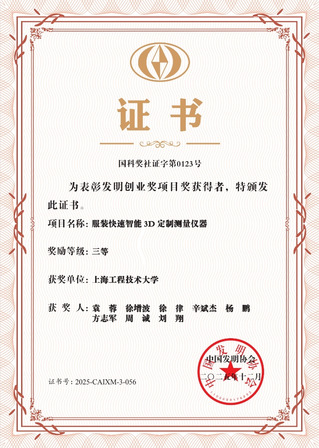 近日,中国发明协会为我校“服装快速智能3D定制测量仪器”颁发三等奖励证书,该项目是袁蓉教授团队继上海市科技进步奖三等奖和中国纺织工业联合会科技进步二等奖后又一次获奖,这是国家大学科技园、纺服学院、电子电气学院、艺术设计学院、信息办、继教学院等学院部门,跨学院、跨学科融合三旋翼的成果。该奖项是经国家科技部批准设立的国家级社会力量设奖,由国家科学技术奖励工作办公室注册登记,评审遵循“不唯学历、职称、资历、身份”原则,由院士及专家委员会严格遴选,注重实际贡献与产业化效益,具备国家科技奖提名推荐资格,是我国发明创新领域的权威荣誉。